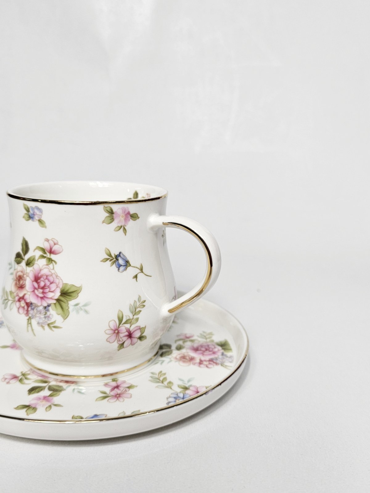 Savurează-ți băutura preferată într-un set elegant compus din ceașcă și farfurioară din ceramică fină, decorate cu motiv floral romantic și accente aurii.