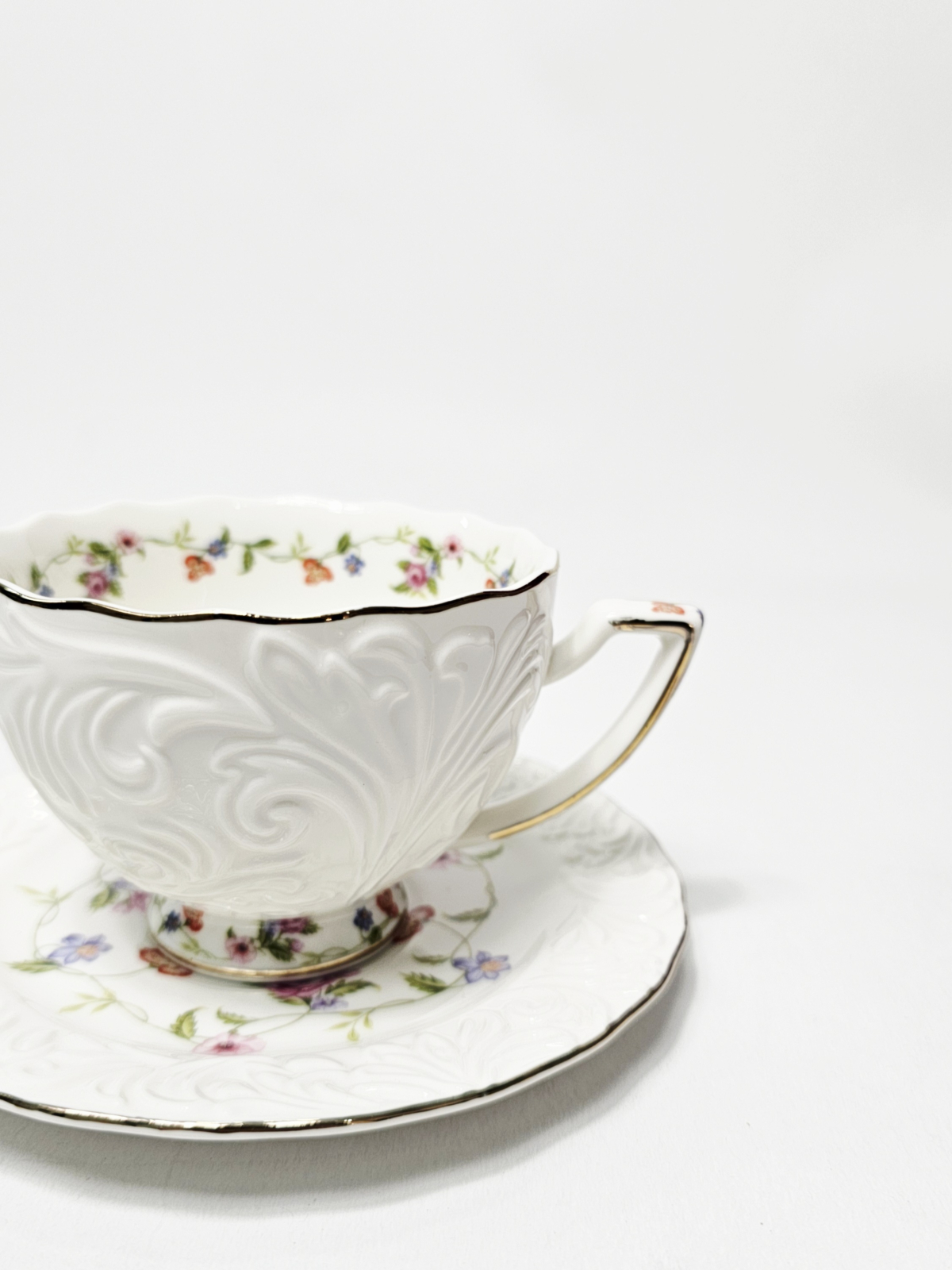 Ceașca de 200 ml este realizată din ceramică albă, cu model în relief și margini aurii, iar farfurioara asortată este decorată cu motive florale multicolore delicate.