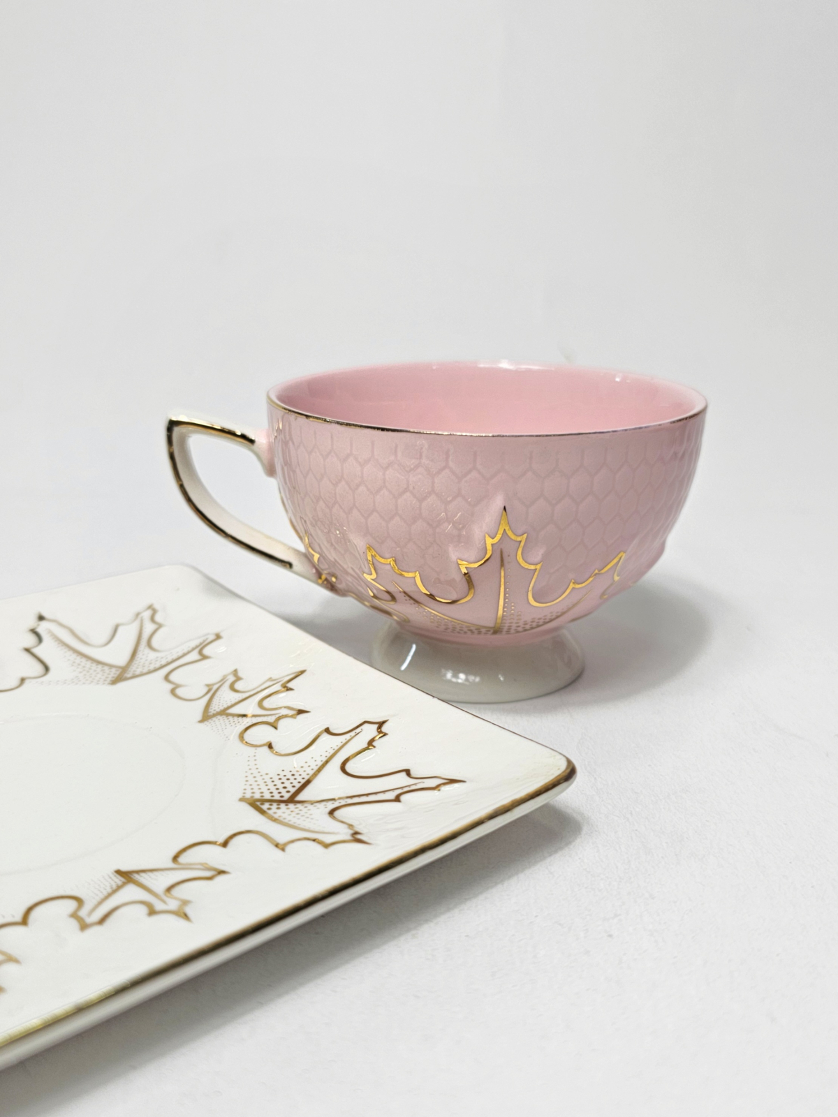Ceașca roz, decorată cu motive aurii în formă de frunze și textură reliefată, se asortează perfect cu farfurioara albă pătrată, decorată în același stil.