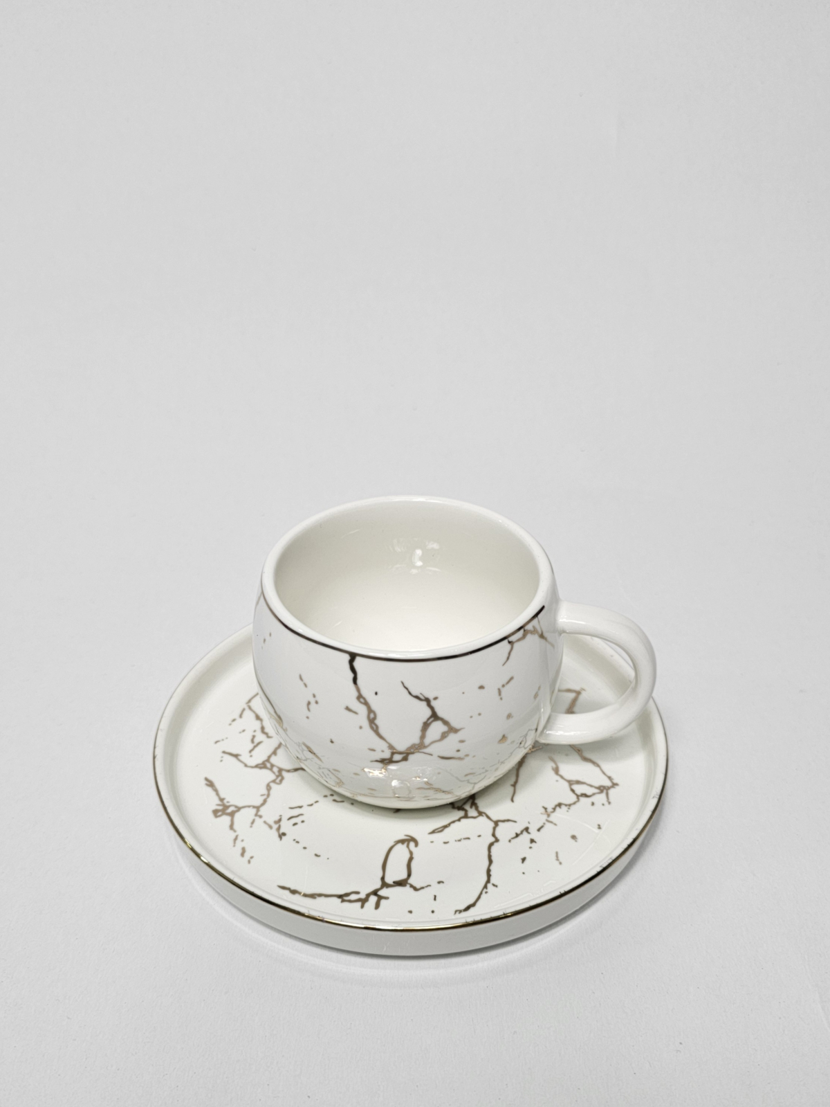 Un set sofisticat, perfect pentru iubitorii de cafea și design modern! Setul este realizat din ceramică albă de înaltă calitate și decorat cu un model marmorat elegant, completat de accente fine.