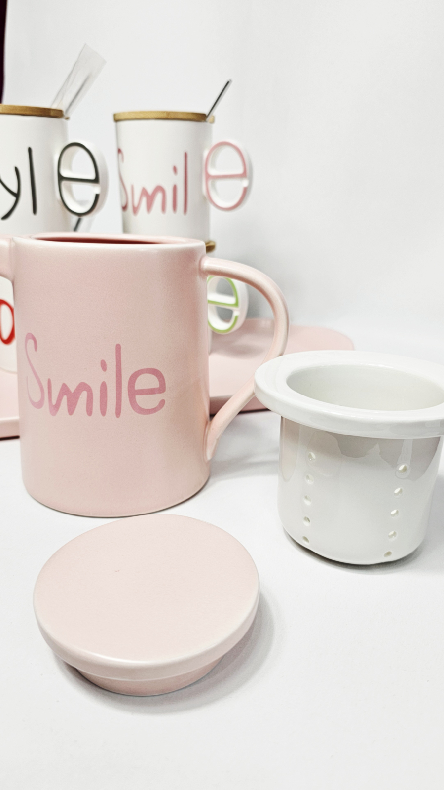 Include un ceainic cu capac/sita interior și 4 cești albe inscripționate cu mesaje inspiraționale („Love”, „Life”, „Smile”), fiecare având capac din bambus pentru a păstra băuturile calde și practice decupaje pentru lingurițe.