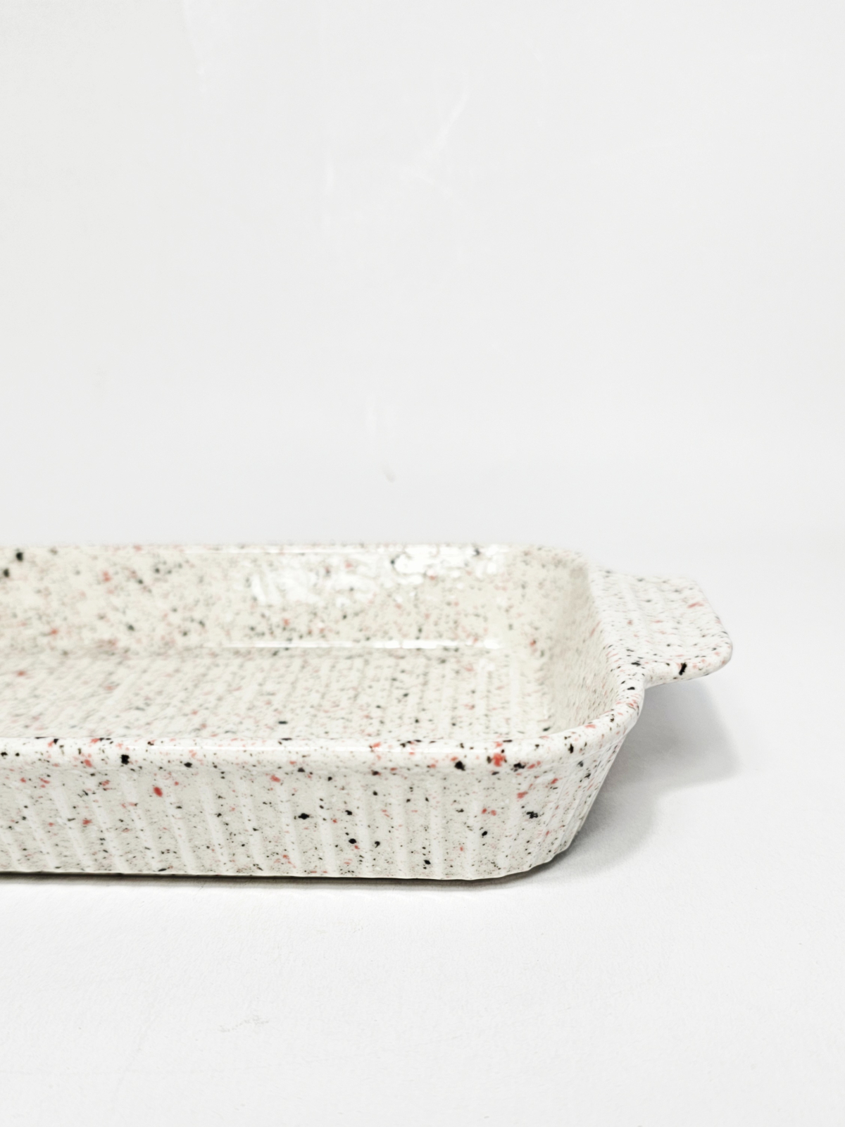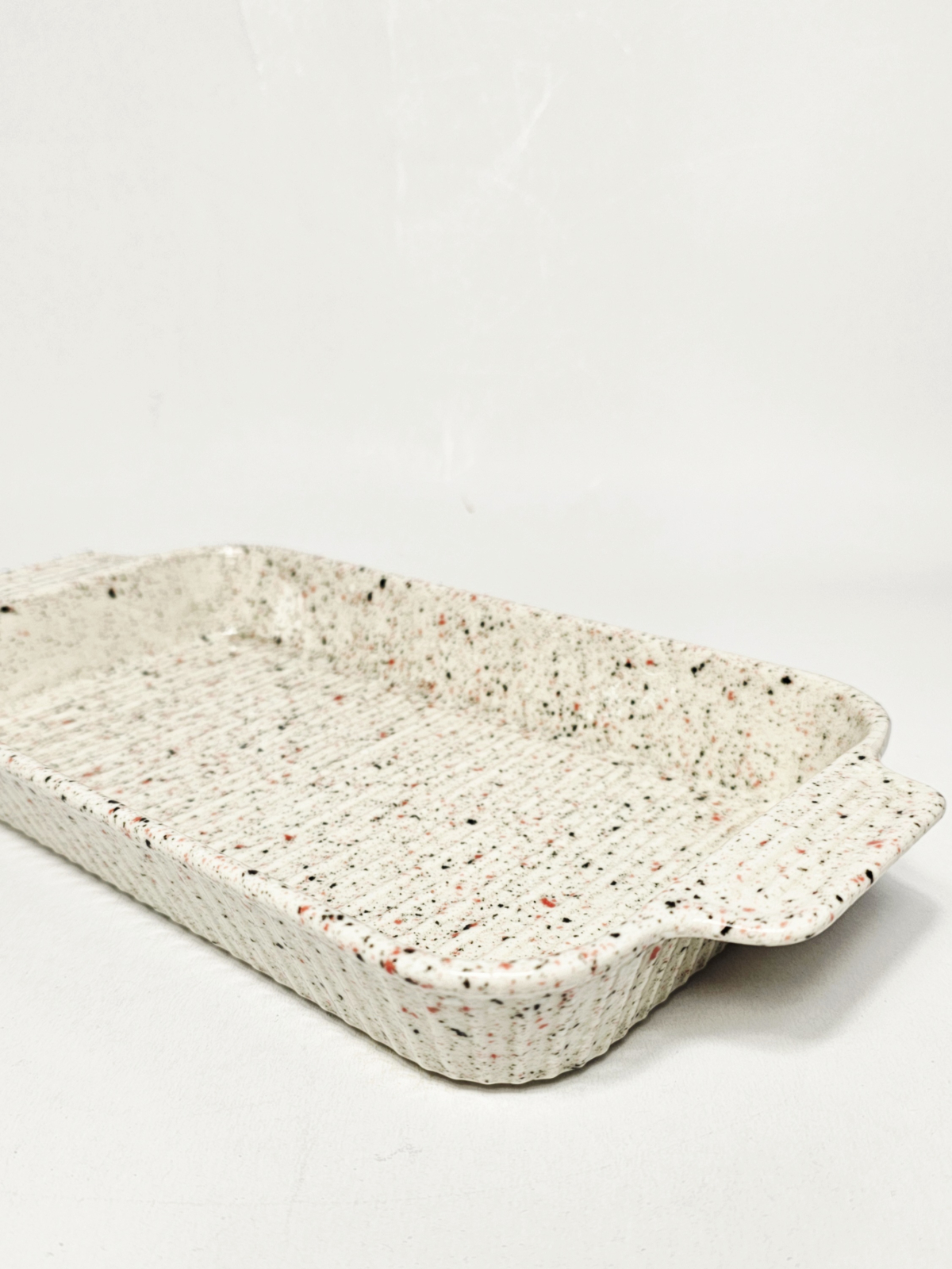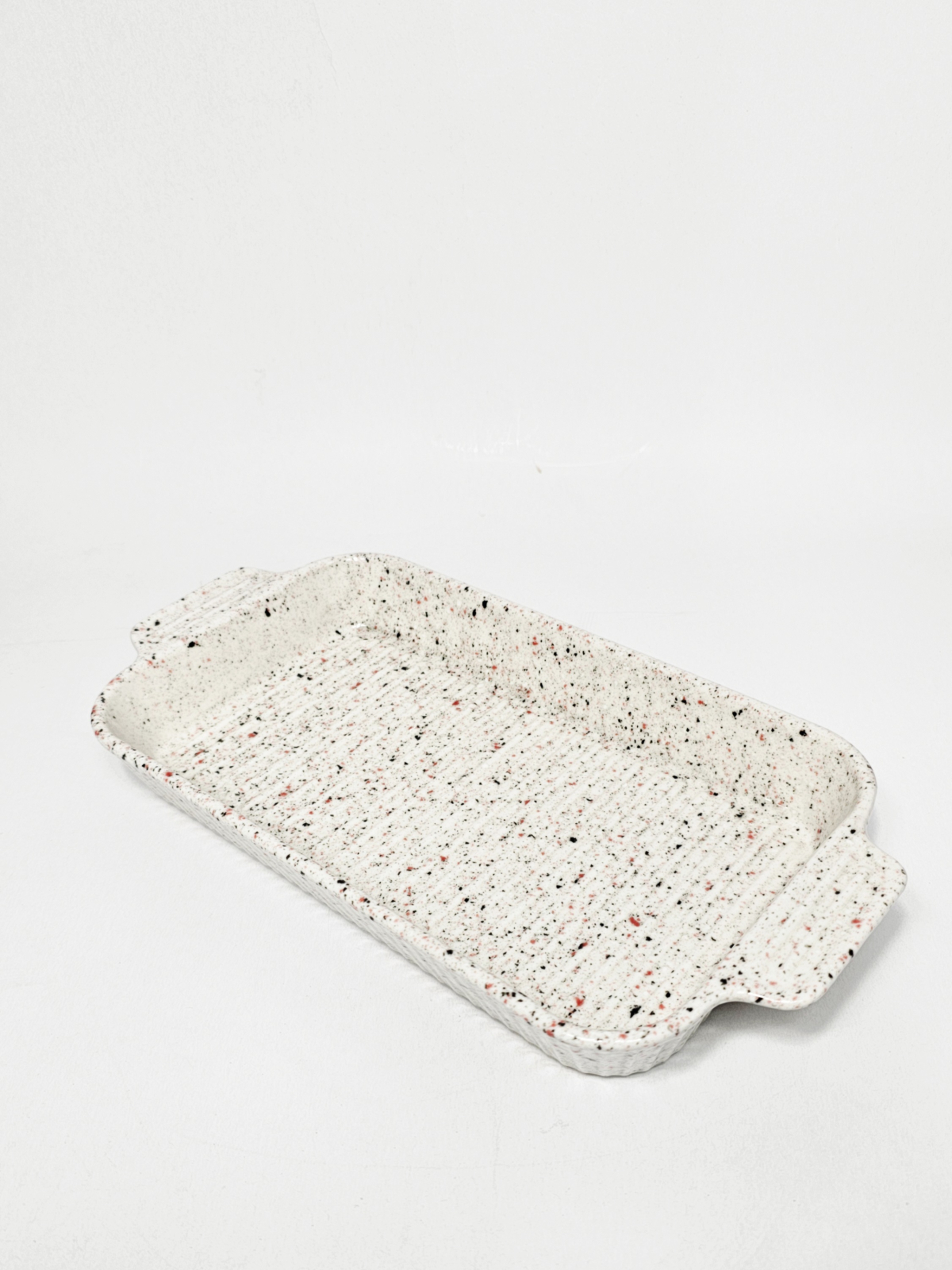 Platoul termorezistent este realizat din ceramică de calitate, rezistentă la temperaturi ridicate, fiind ideal pentru gătit la cuptor și servire direct la masă.